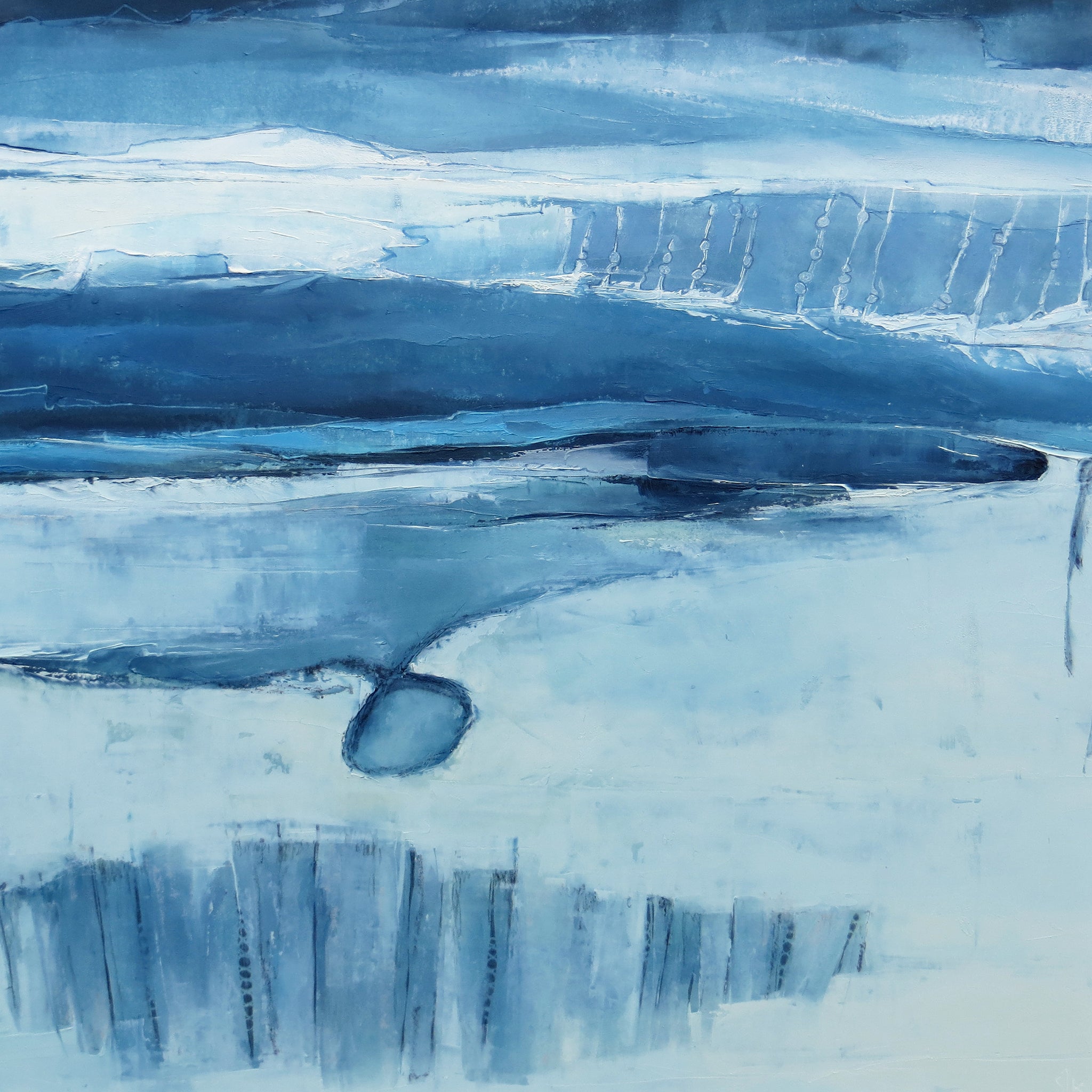 Original semi-abstract oil seascape. Created using a fine base layer of colour, painted over with a palette knife adding depth and texture. Finished with sketched pencil details and areas of linocut cell structure patterns. Plus 3 detail shotes to show surface texture.
